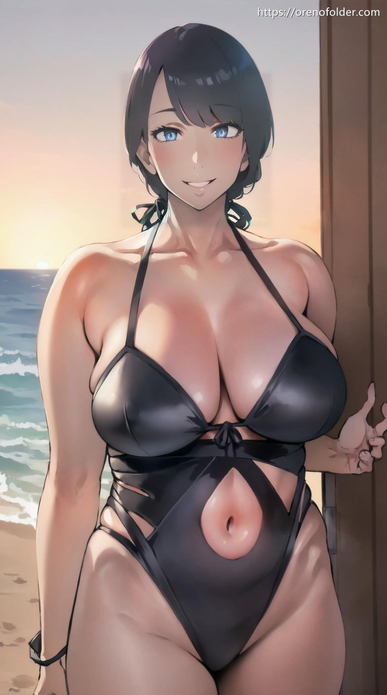 スマイル, セミロング, ハイレグ, ハミ乳, ビーチ, むちむち, 巨乳, 横乳, 水着, 海, 爆乳, 砂浜, 野外, 黒, 黒髪