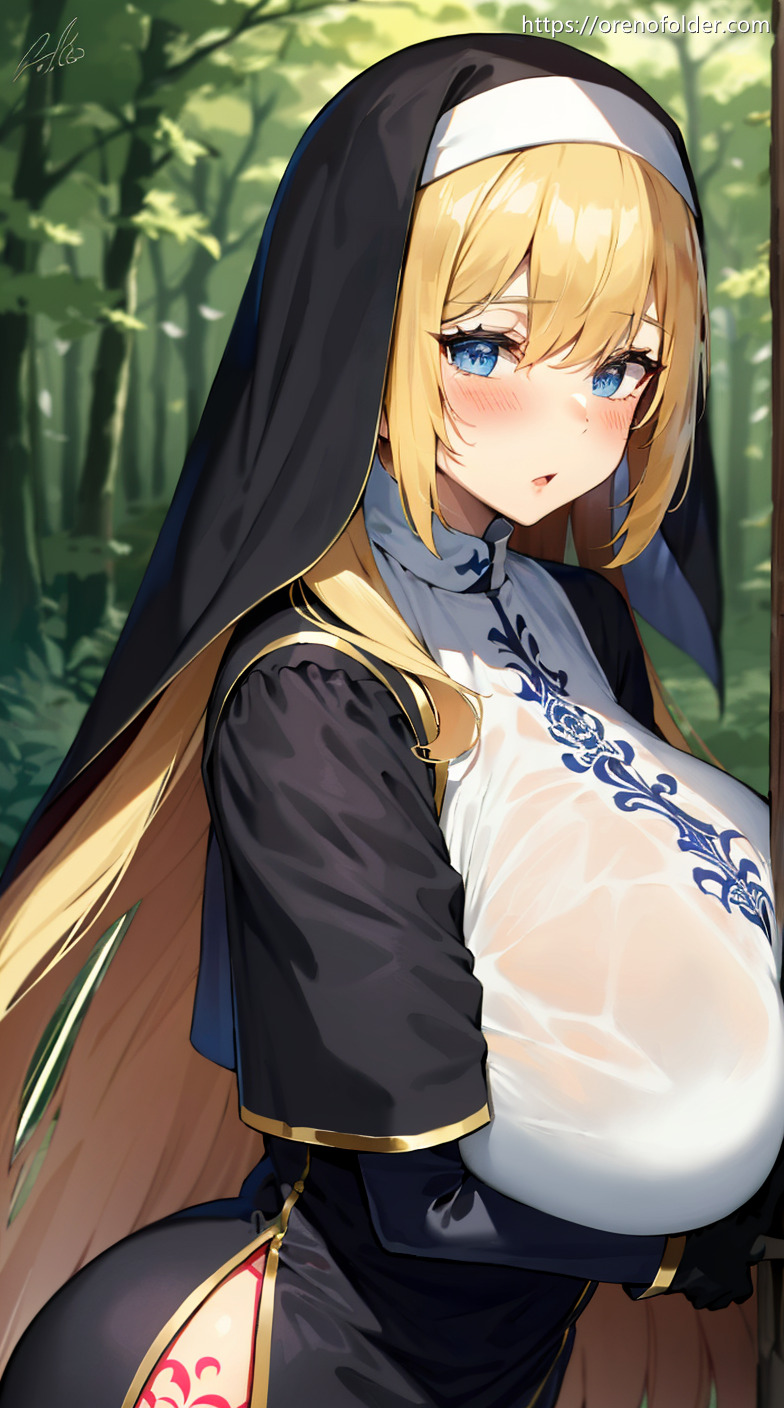 グローブ, 修道女, シスター, たくし上げ, ファンタジー, マン毛, むちむち, ロングヘアー, コスプレ, 手袋, 巨乳, 森林, 汗, 爆乳, 腋パイ, 野外, 金髪, 陰毛