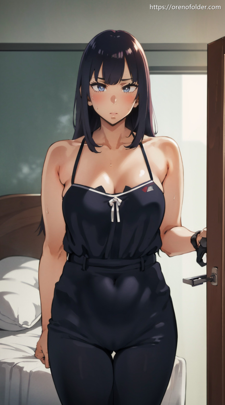 ストレート, ニーソ, ハイレグ, マンスジ, むちむち, ロングヘアー, 困り顔, 巨乳, 照れ, 爆乳, 着衣, 黒ニーソ, 黒髪, 鼠径部