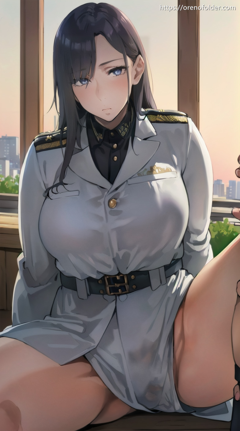 すまし顔, ノーブラ, ロングヘアー, 巨乳, 座り, 爆乳, 生足, 着衣, 茶髪, 谷間, 軍服, 開脚
