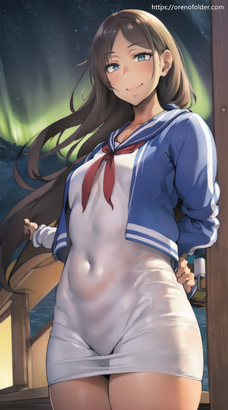 jk, おっぱい, サイドテール, ショートヘアー, セーラー服, たくし上げ, パイパン, へそ, むちむち, ローアングル, 制服, 巨乳, 爆乳, 茶髪, 褐色, 野外