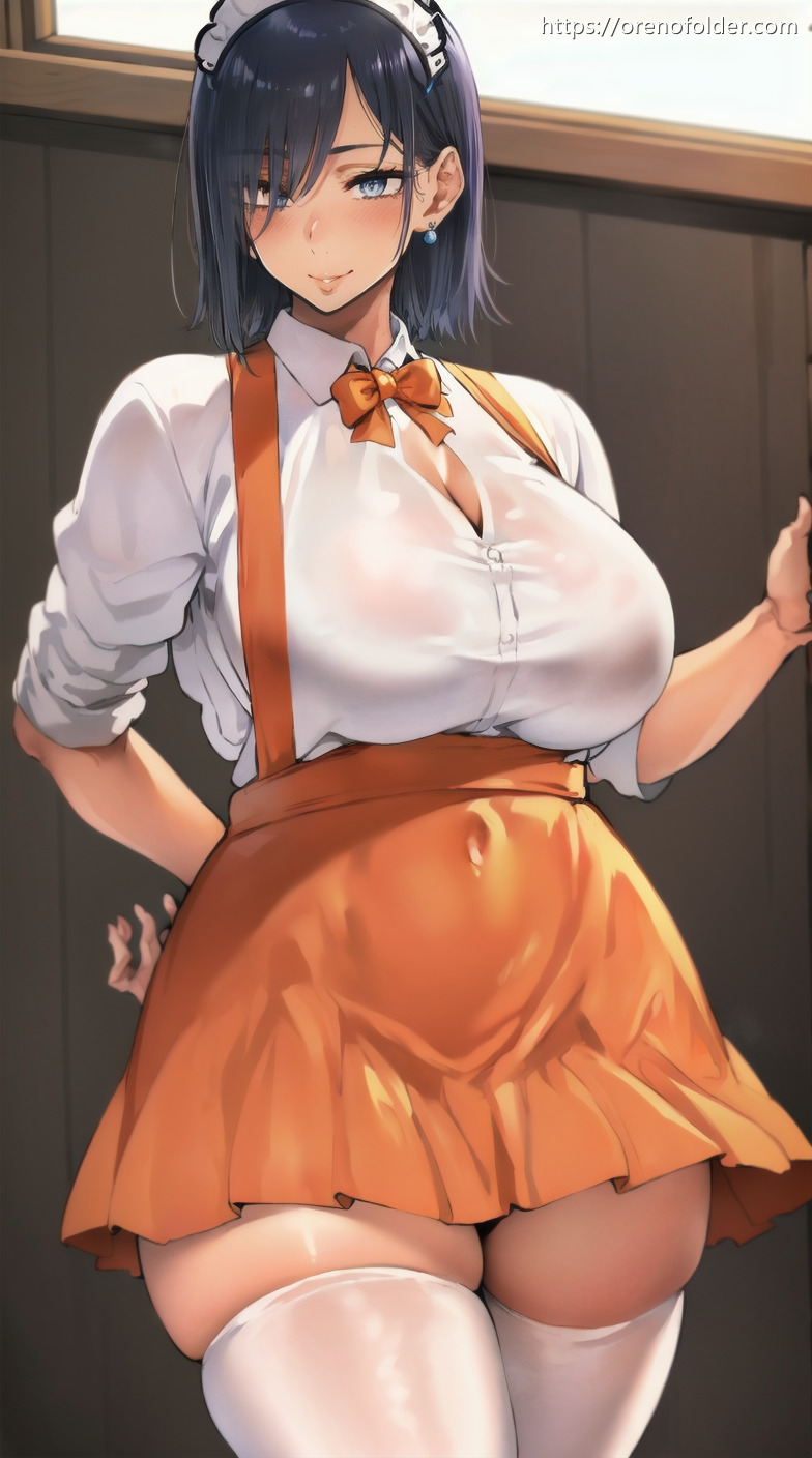 Tバック, オレンジ, ショートヘアー, ストッキング, たくし上げ, パンチラ, ピアス, フリル, メイド, 巨乳, 巨尻, 振り向き, 横向き, 爆乳, 谷間, 食い込み, 黒, 黒ストッキング, 黒髪