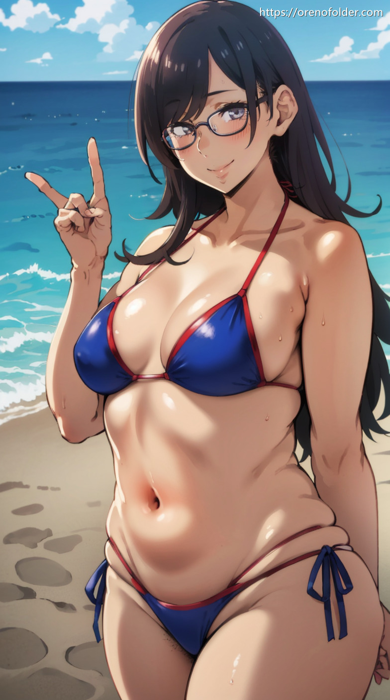 おかっぱ, スマイル, ハニカミ, ハミ乳, ビーチ, ビキニ, むちむち, 下乳, 巨乳, 横乳, 水着, 海, 爆乳, 砂浜, 紐水着, 野外, 青, 黒髪, 鼠径部
