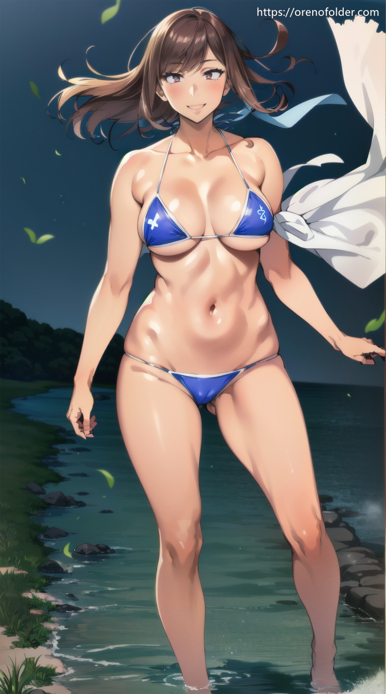 セミロング, ハミ乳, ビキニ, マイクロビキニ, むちむち, 下乳, 巨乳, 微笑, 横乳, 水着, 爆乳, 離れ乳, 青, 黒髪