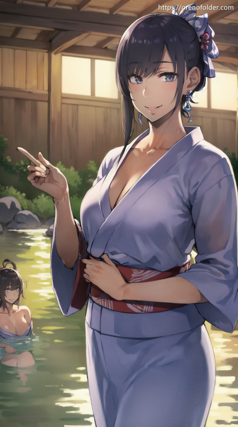 いじわる, ガーターベルト, スマイル, ハミ毛, パンツ, パンティ, パンモロ, マン毛, 和服, 和洋折衷, 小悪魔, 巨乳, 爆乳, 着崩れ, 着物, 着衣, 谷間, 陰毛, 青, 黒髪, 鼠径部