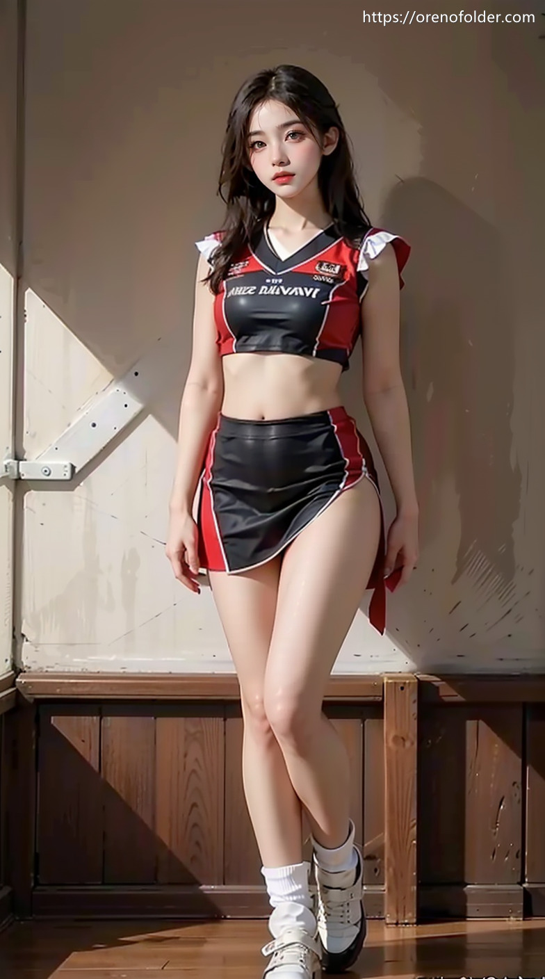 セミロング, チアガール, チアリーダー, プリーツスカート, へそチラ, ボンボン, ミニスカ, 太もも, 生足, 白, 美脚, 赤, 髪飾り, 黒髪