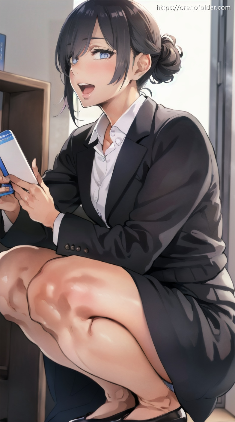 OL, しゃがみ, ショートヘアー, スーツ, スマイル, むちむち, 太もも, 生足, 着衣, 黒, 黒髪