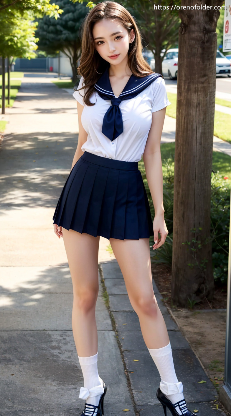 jk, セーラーぐく, ハイヒール, プリーツスカート, ミニスカ, ロングヘアー, 制服, 夏服, 巨乳, 白ソックス, 着衣, 美脚, 茶髪, 野外