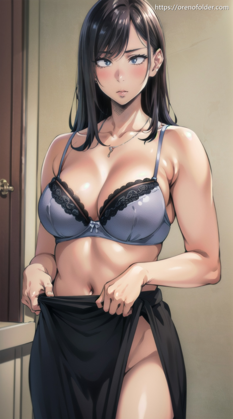 しかめっ面, セミロング, むちむち, 下着, 下着姿, 巨乳, 水色, 褐色, 谷間, 黒髪