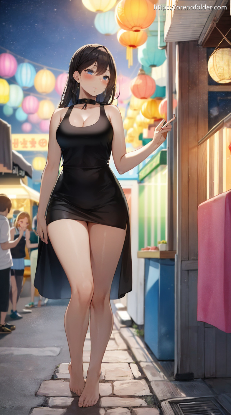ショートパンツ, デニム, ホットパンツ, ロングヘアー, 出店, 夜, 巨乳, 爆乳, 生足, 白, 着衣, 谷間, 野外, 黒, 黒髪