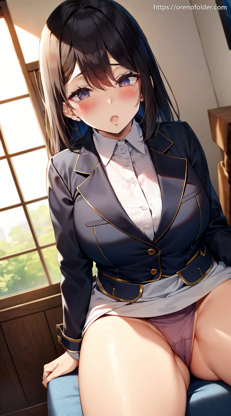 すまし顔, ロングヘアー, 太もも, 座り, 生足, 白, 着衣, 軍服, 開脚, 黒髪