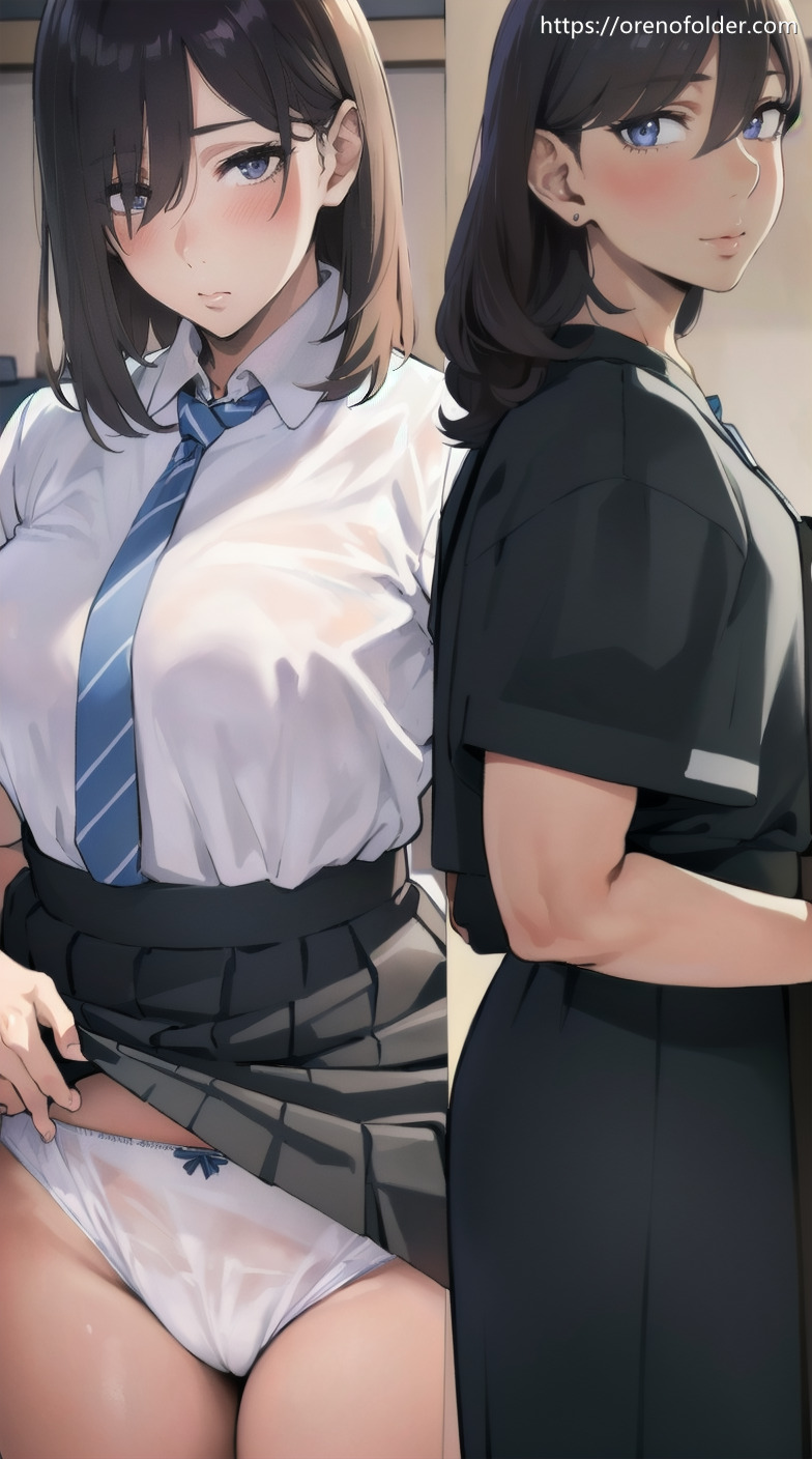 jk, セミロング, たくし上げ, パンチラ, ヘアピン, ミニスカ, むちむち, ローアングル, 制服, 太もも, 巨乳, 爆乳, 着衣, 黒髪