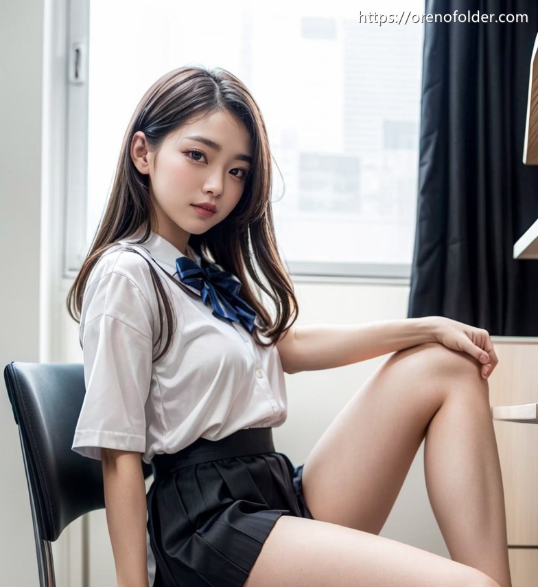 jk, セミロング, ミニスカ, 制服, 夏服, 太もも, 座り, 生足, 着衣, 黒髪