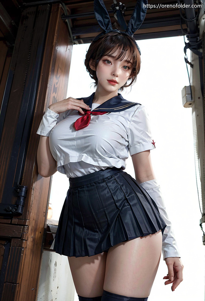 jk, うさ耳, コスプレ, ショートヘアー, セーラー服, ニーソ, ノーブラ, バニー, ハミ乳, プリーツスカート, ミニスカ, 下乳, 制服, 夏服, 夕方, 夕日, 夕焼け, 太もも, 巨乳, 海, 港, 爆乳, 白ニーソ, 着衣, 絶対領域, 茶髪, 軍艦, 野外, 食い込み