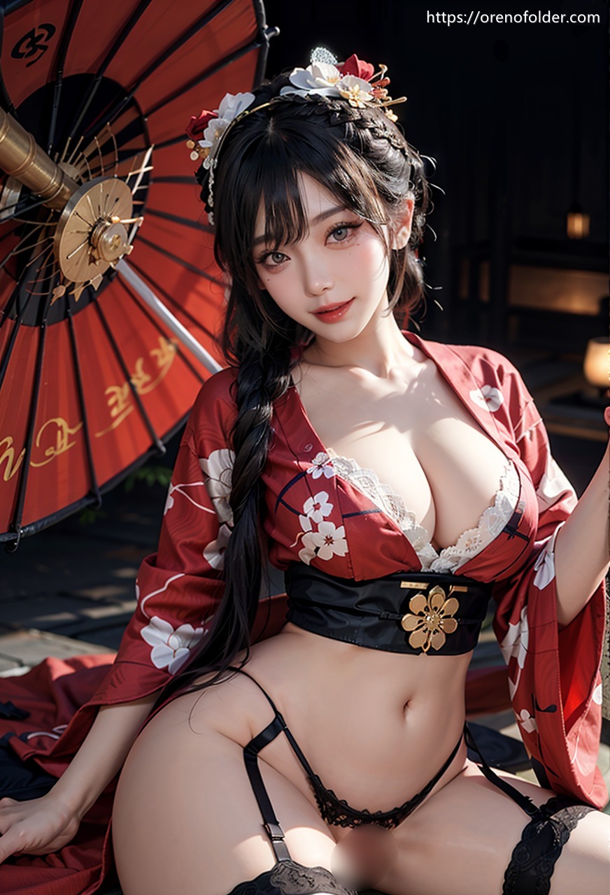 ガーターベルト, ノーパン, ロングヘアー, 三つ編み, 下着, 半脱ぎ, 和装, 巨乳, 微笑, 花柄, 谷間, 赤, 髪飾り, 黒, 黒髪