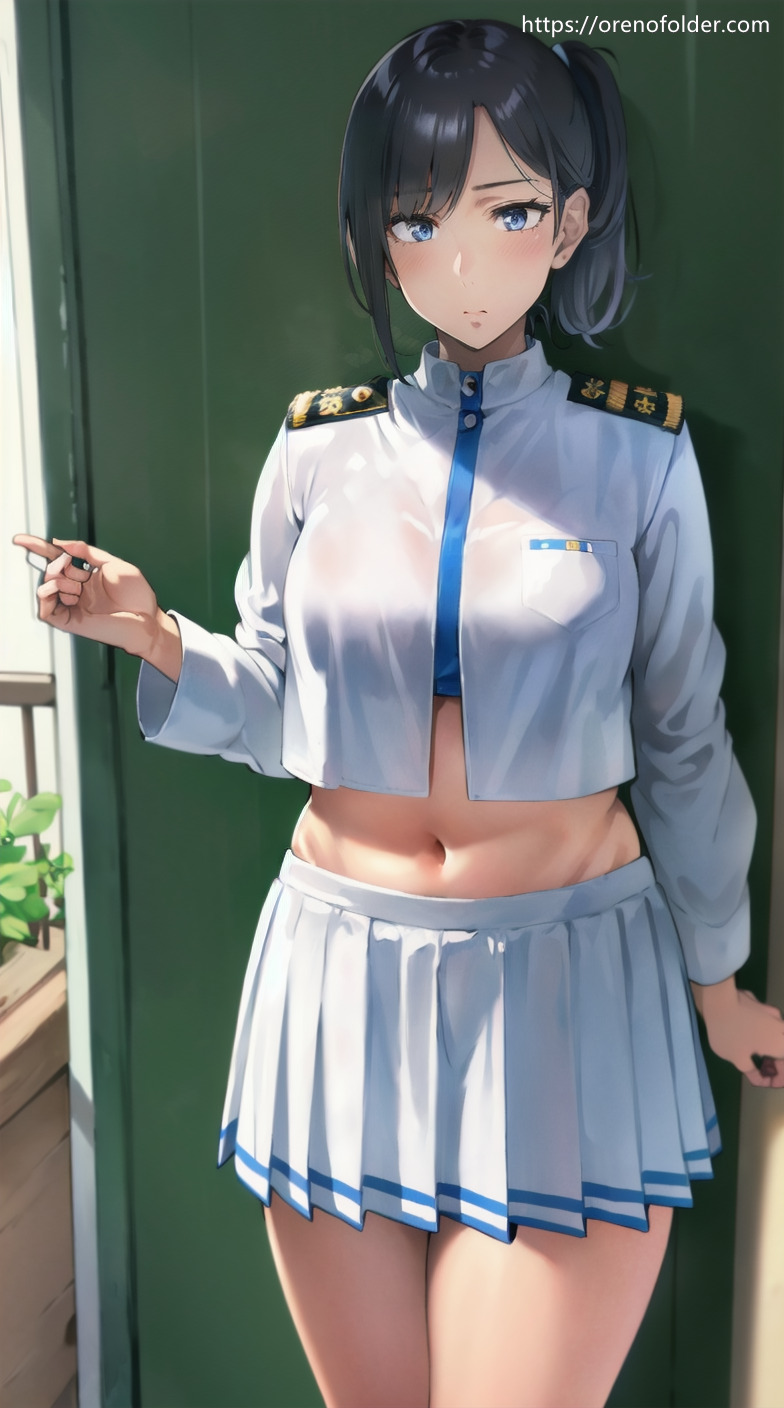 プリーツスカート, へそチラ, ポニーテール, ミニスカ, 巨乳, 水兵, 白, 着衣, 軍服, 黒髪