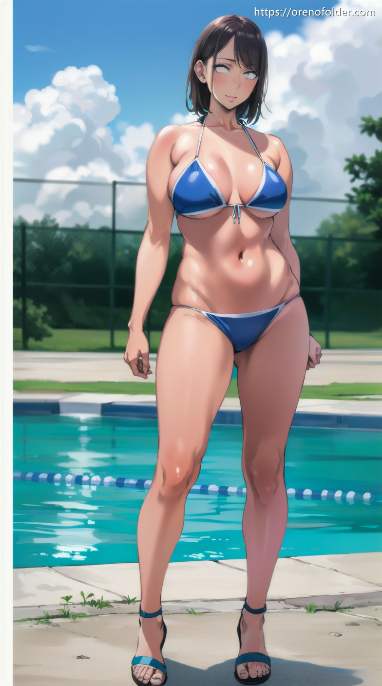 ショートヘアー, ハミ乳, ビキニ, プール, マイクロビキニ, むちむち, 外ハネ, 巨乳, 日焼け, 横乳, 水着, 照れ, 爆乳, 白, 紐水着, 褐色, 超乳, 野外, 黒髪