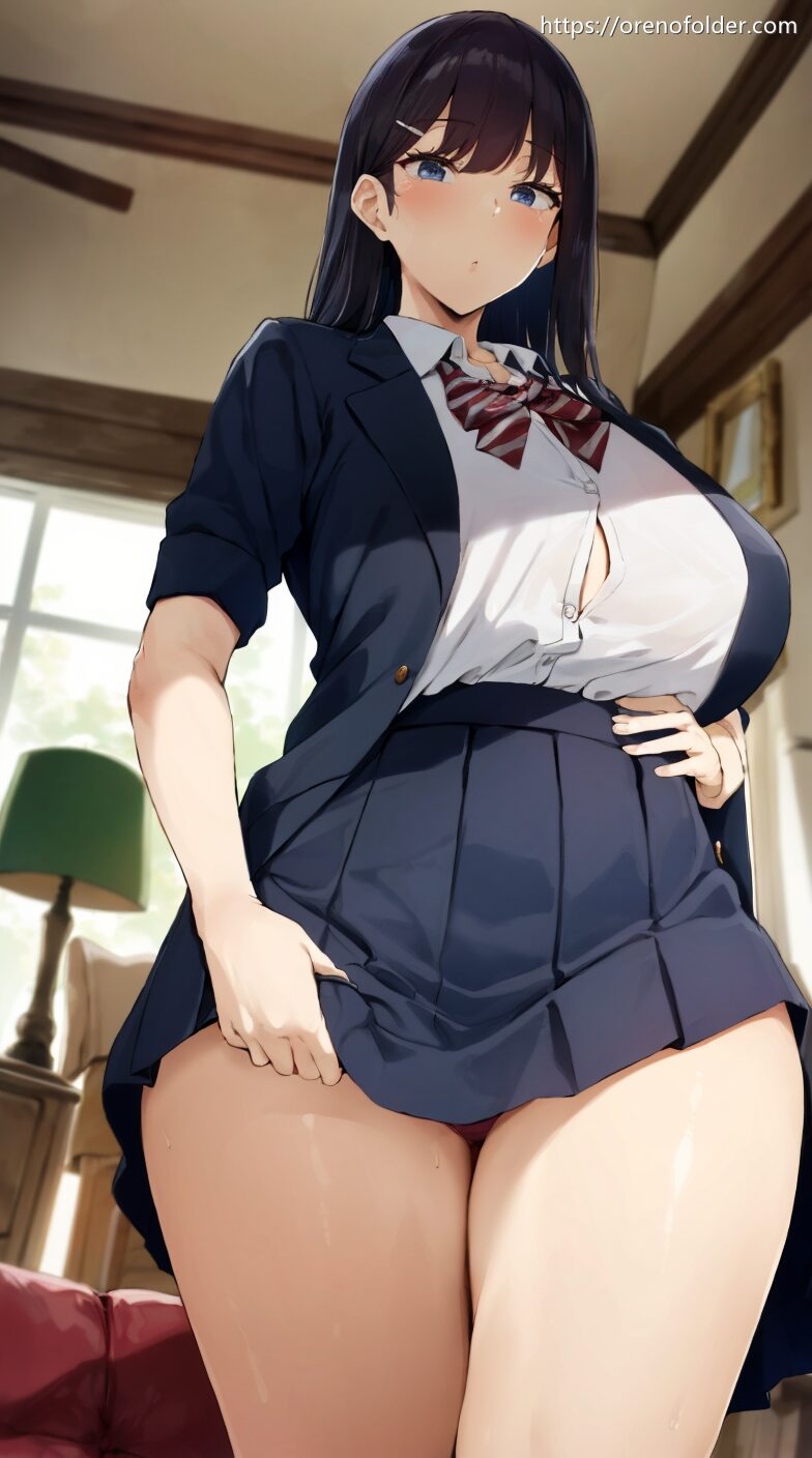 おっぱい, サスペンダー, スマイル, セミロング, パンチラ, プリーツスカート, ミニスカ, むちむち, ローアングル, ローレグ, 巨乳, 黒, 黒乳首, 黒髪