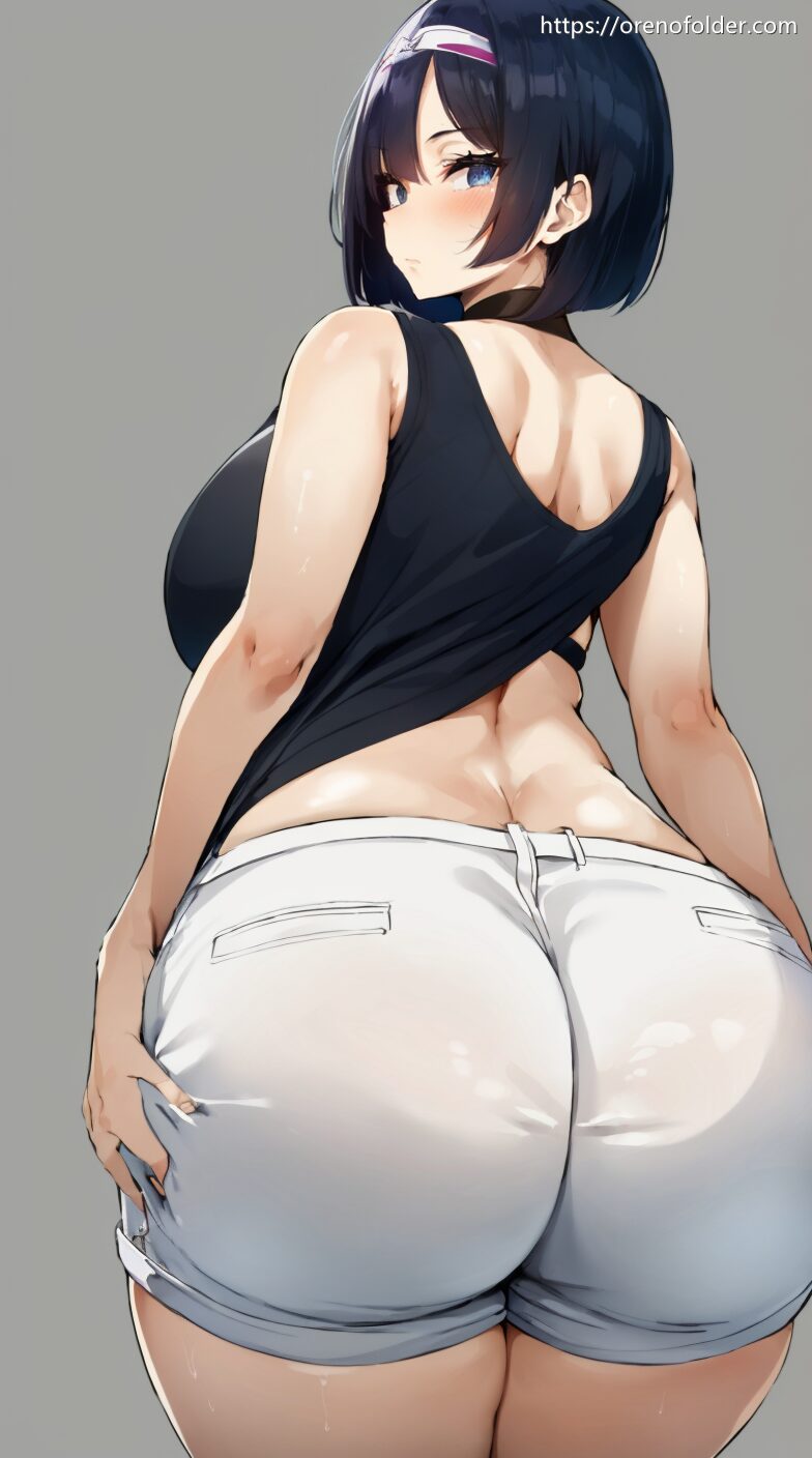 ショートパンツ, ショートヘアー, すまし顔, ノースリーブ, ホットパンツ, むちむち, 下尻, 巨乳, 巨尻, 座り, 後ろ向き, 振り向き, 爆乳, 着衣, 食い込み, 黒, 黒髪