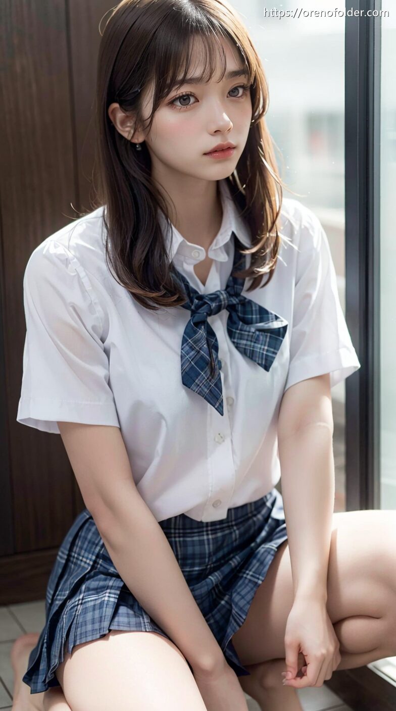 jk, セミロング, チェック柄, プリーツスカート, ミニスカ, 制服, 夏服, 太もも, 女の子座り, 座り, 生足, 着衣, 茶髪