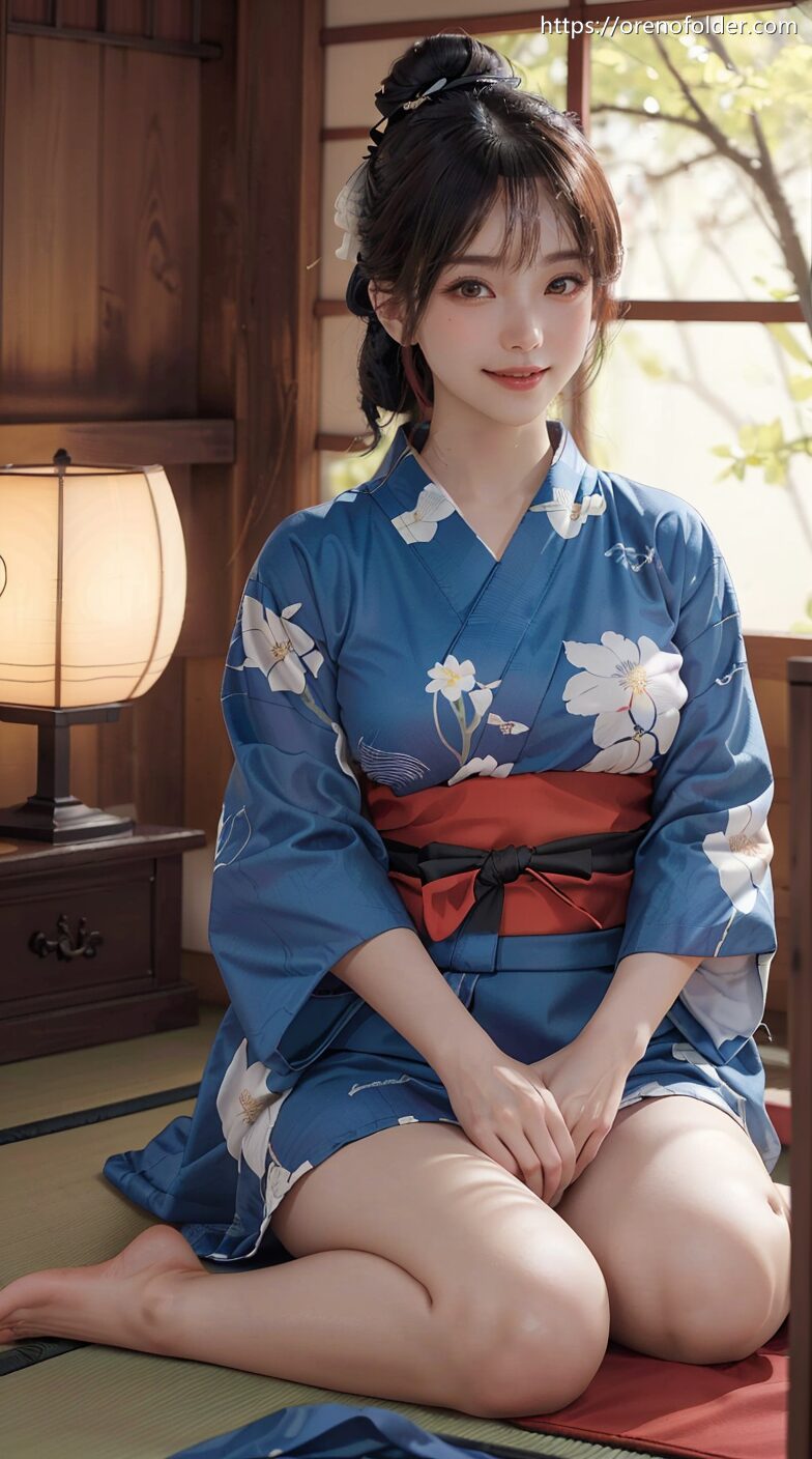 お団子ヘアー, ストッキング, スマイル, パンツ, パンティ, ローレグ, 半ケツ, 和室, 和服, 座り, 後ろ向き, 振り返り, 畳, 着物, 着衣, 背中, 脱衣, 花柄, 花飾り, 茶髪, 透け, 髪飾り, 黒ストッキング