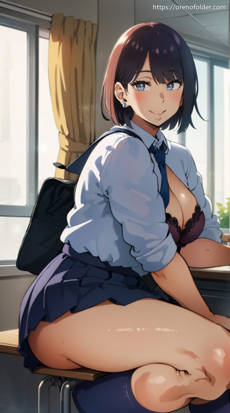 スマイル, セミロング, ブラジャー, むちむち, 半脱ぎ, 巨乳, 教室, 爆乳, 脱衣, 膝立ち, 谷間, 超乳, 黒, 黒髪