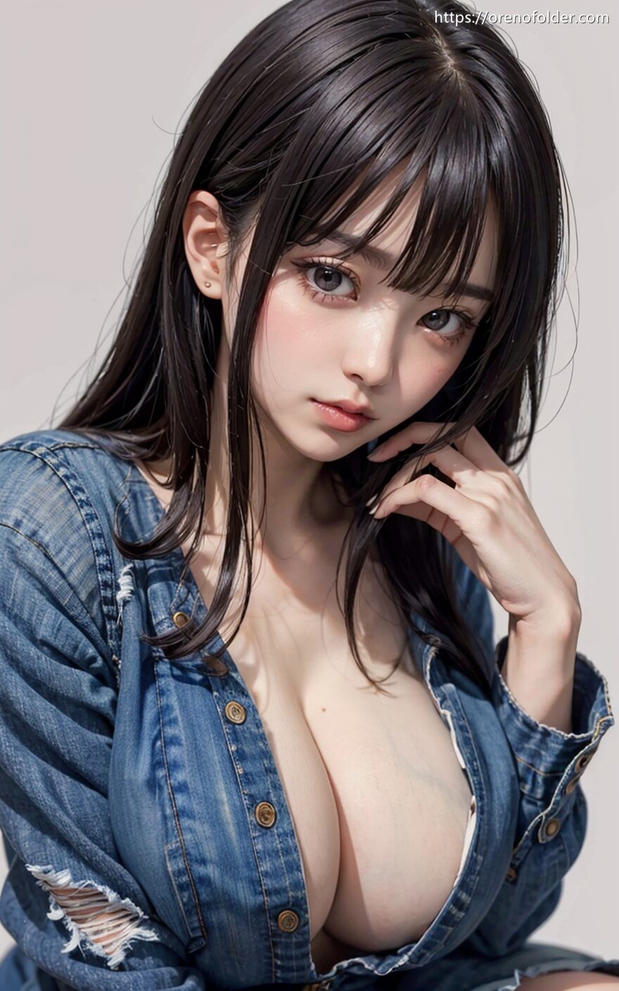 おっぱい, ハミ乳首, ジーパン, ジーンズ, ショートパンツ, セミロング, チョーカー, デニム, ハミ乳, サスペンダー, ポロリ, ホットパンツ, 太もも, 巨乳, 座り, 爆乳, 着衣, 谷間, 青, 黒髪