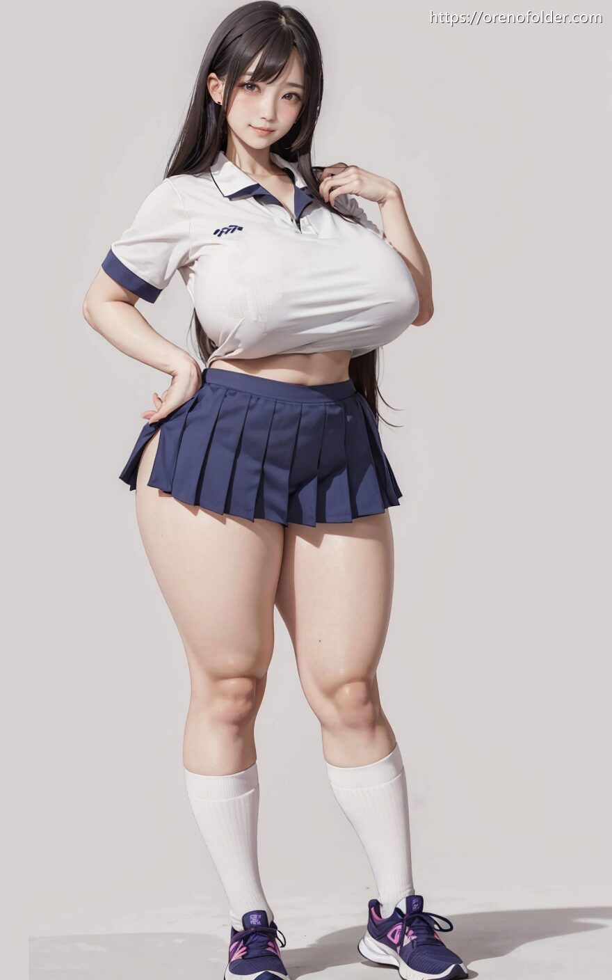 ハイソックス, プリーツスカート, ミニスカート, むちむち, ロングヘアー, 制服, 夏服, 太もも, 巨乳, 微笑, 爆乳, 白, 白ソックス, 着衣, 黒髪