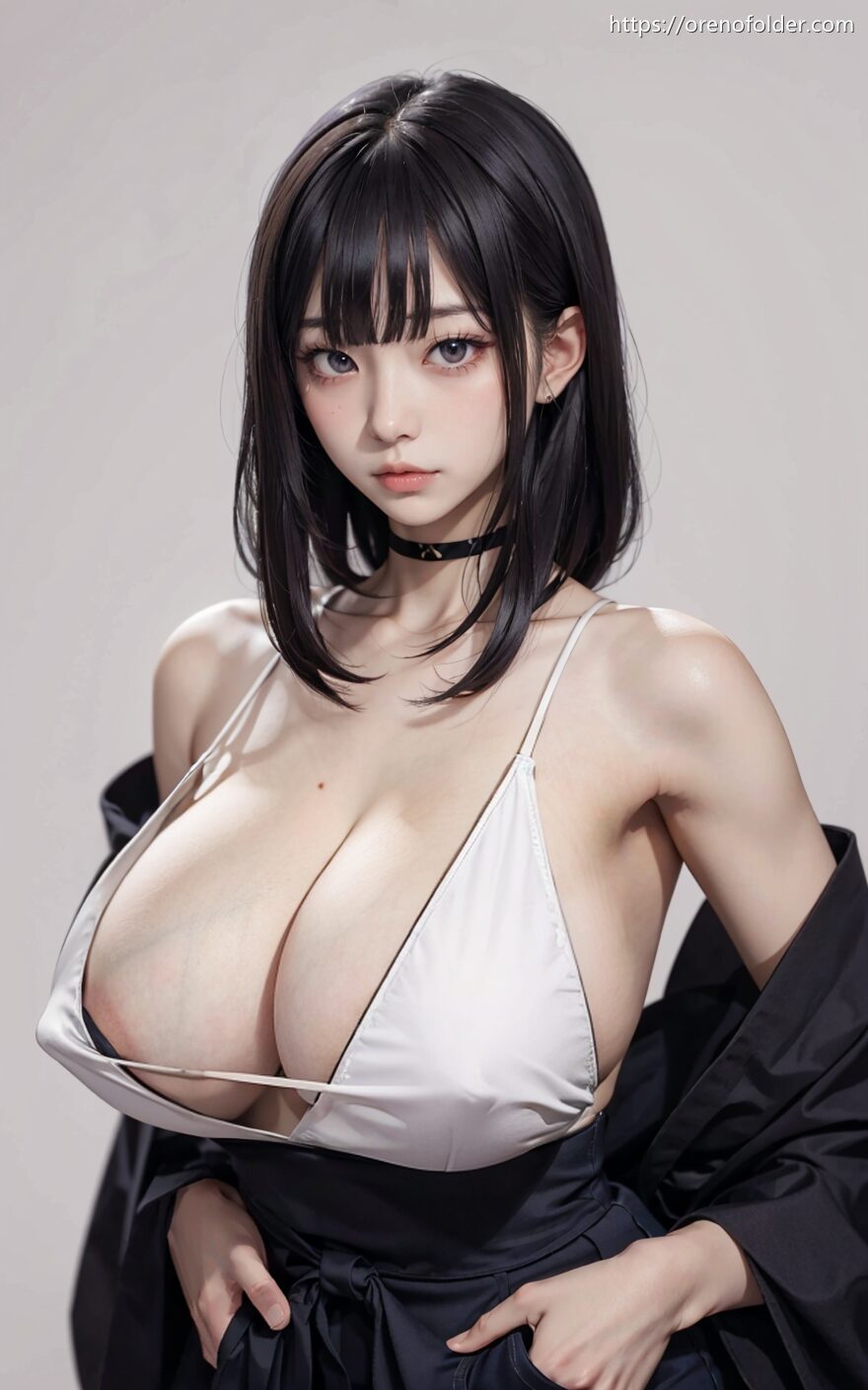 おっぱい, ハミ乳輪, ポロリ, ロングヘアー, 巨乳, 座り, 爆乳, 着衣, 血管, 谷間, 青筋, 静脈, 黒, 黒髪