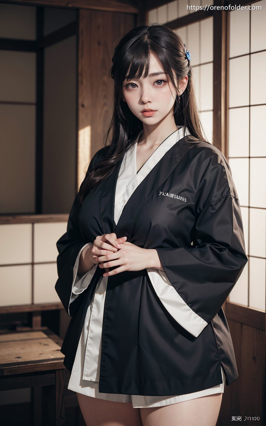 コスプレ, 横乳, チョーカー, ハミ乳, ブラジャー, ホットパンツ, ロングヘアー, 下着, 和装, 太もも, 巨乳, ショートパンツ, 生足, 爆乳, 白, 着衣, 美脚, 花柄, 血管, 谷間, 青筋, 静脈, 黒, 黒髪