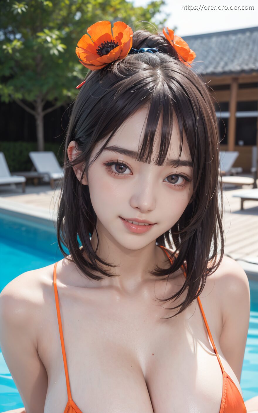オレンジ, ショートヘアー, スマイル, ビキニ, ピンク, プール, 入水, 巨乳, 水着, 花飾り, 茶髪, 谷間, 野外, 髪飾り