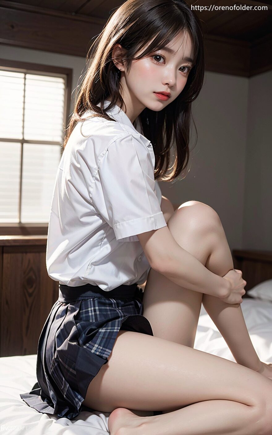 jk, セミロング, プリーツスカート, ベッド, ミニスカ, 制服, 太もも, 座り, 振り向き, 生足, 着衣, 黒髪