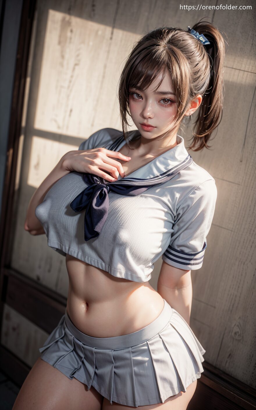 jk, ミニスカ, セーラー服, ノーブラ, ハミ乳, プリーツスカート, へそ, ポニーテール, コスプレ, 制服, 下乳, 夏服, 巨乳, 座り, 爆乳, 白, 着衣, 茶髪