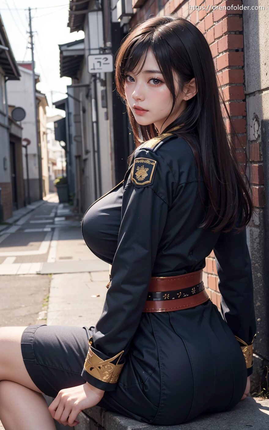 コスプレ, ミニスカ, ロングヘアー, 太もも, 巨乳, 帽子, 座り, 爆乳, 生足, 着衣, 茶髪, 軍服, 野外, 開脚, 黒