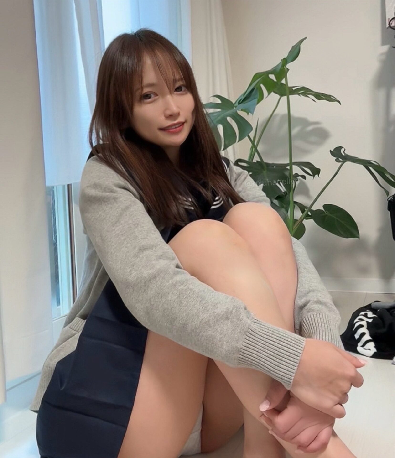 AV女優, ミニスカ, スマイル, セミロング, チェック柄, パンチラ, パンツ, ピースサイン, jk, 夏服, 制服, 太もも, 座り, 着衣, 立膝, 花柄, 花柳杏奈, 黒髪