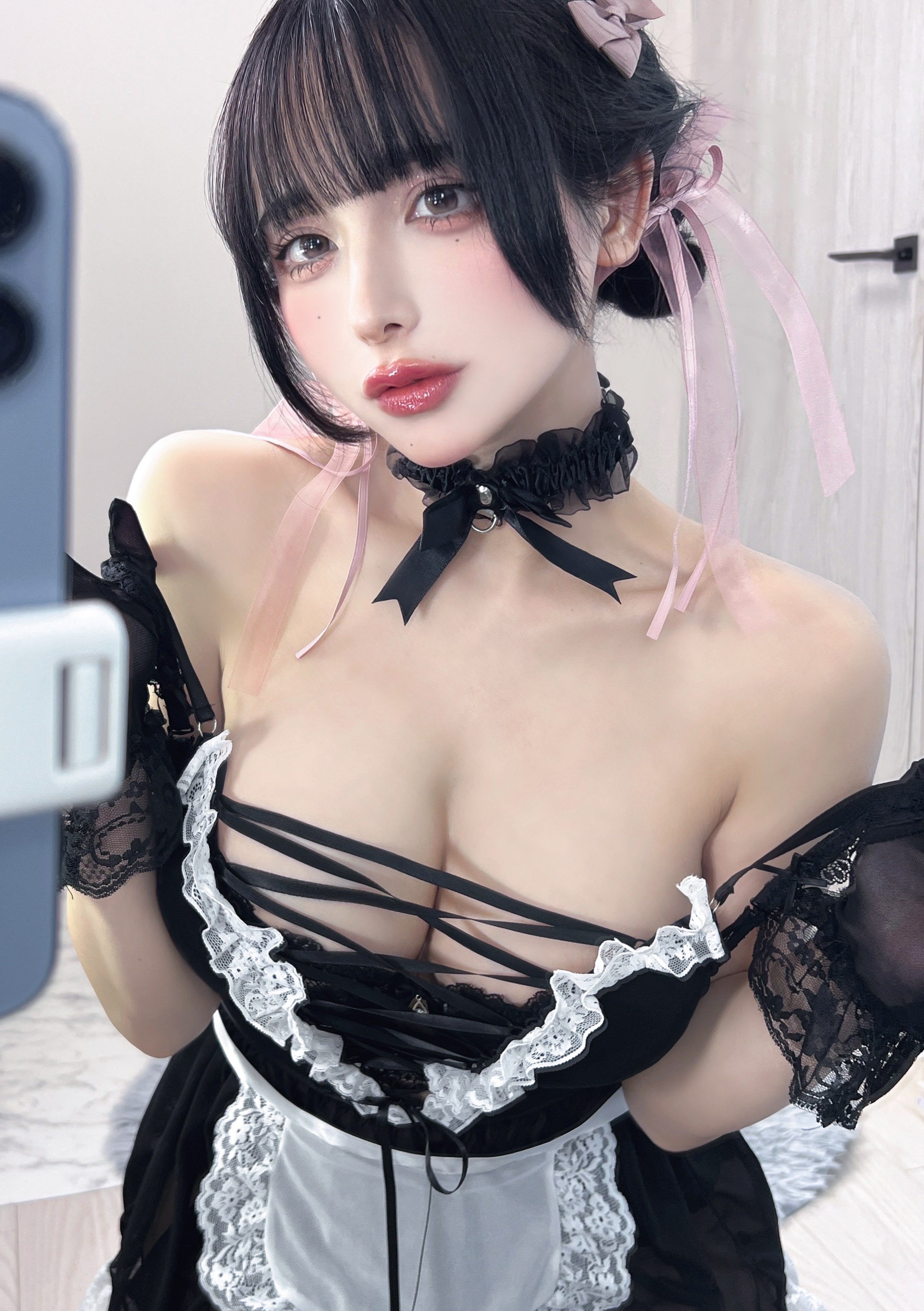 コスプレ, コスプレイヤー, ストッキング, ミニスカ, メイド, 下乳, 前屈み, 小仓千代, 巨乳, 爆乳, 白, 白ストッキング, 着衣, 膝立ち, 黒, 黒髪