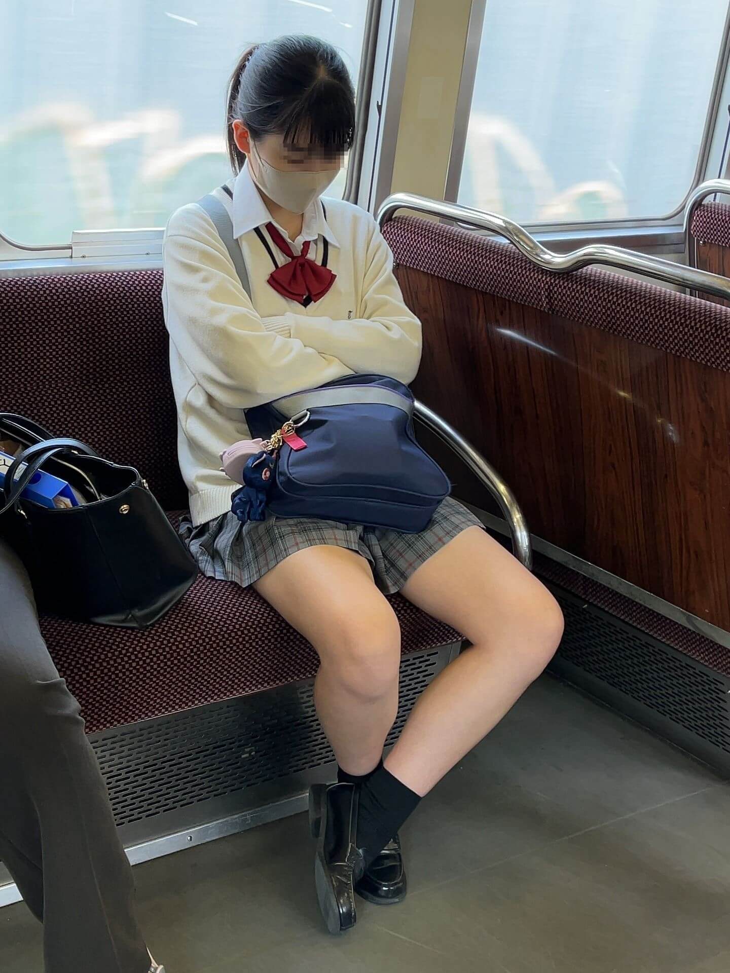 jk,パーマ,マスク,制服,対面,生足,盗撮,電車,
