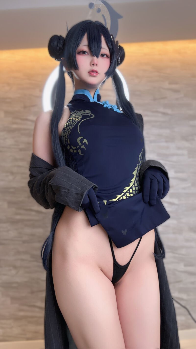 Tバック, コスプレ, コスプレイヤー, ストッキング, ベージュ, ロングヘアー, 巨尻, 幾楽うにゃる, 横向き, 着衣, 花柄, 角, 赤, 青, 食い込み, 黒髪