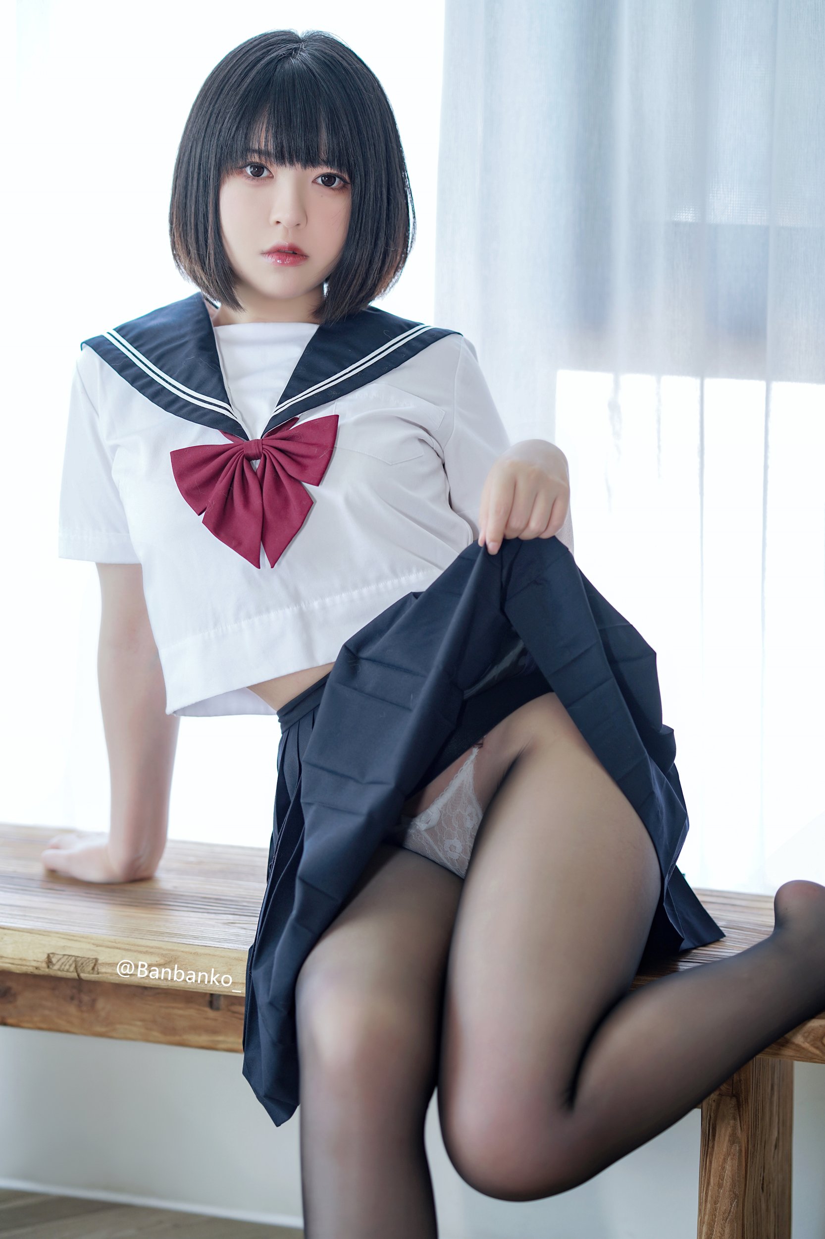 jk, あまつまりな, コスプレ, コスプレイヤー, ストッキング, セーラー服, たくし上げ, パンチラ, 制服, 黒ストッキング