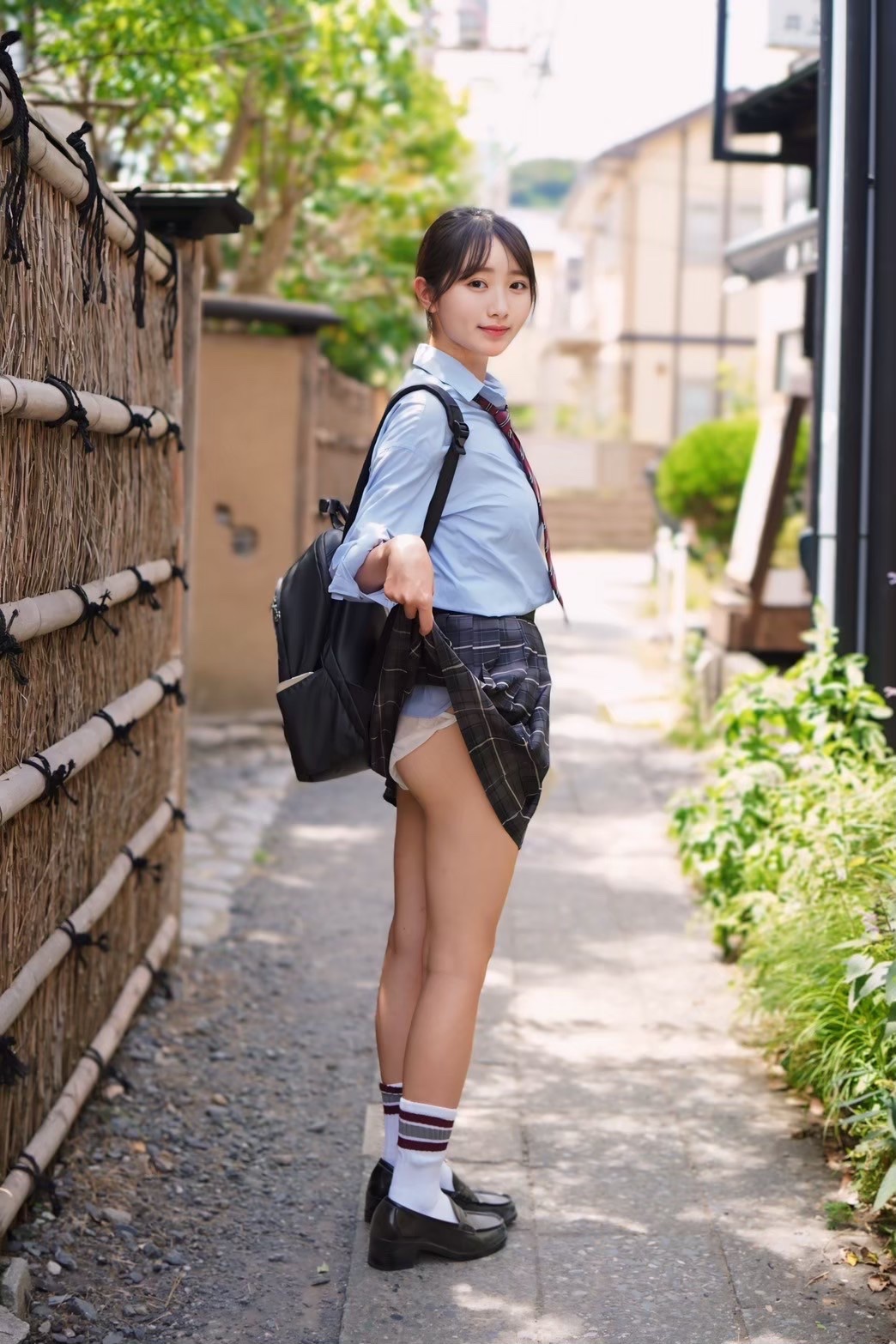 jk, パンチラ, パンツ, パンティ, プリーツスカート, ミニスカ, もも裏, ローアングル, 下尻, 中間服, 制服, 太もも, 後ろ向き, 歩き, 生足, 白, 着衣, 逆さ撮り, 食い込み