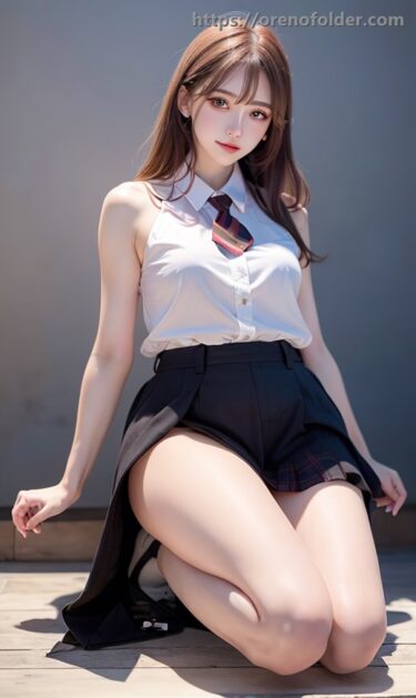 jk, ノーパン, プリーツスカート, ミニスカ, ロングヘアー, 制服, 太もも, 座り, 生足, 着衣, 茶髪