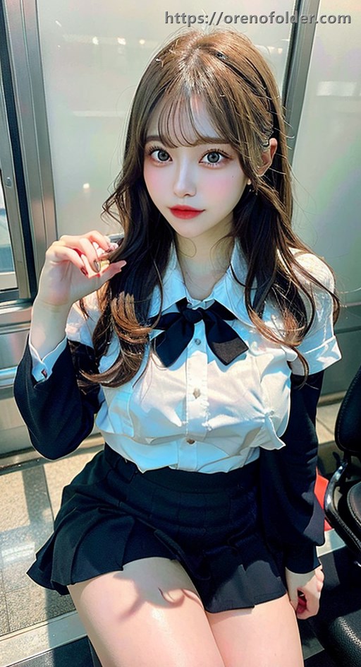 jk, セミロング, ミニスカ, 制服, 太もも, 巨乳, 座り, 微笑, 爆乳, 生足, 着衣, 着衣巨乳, 黒髪