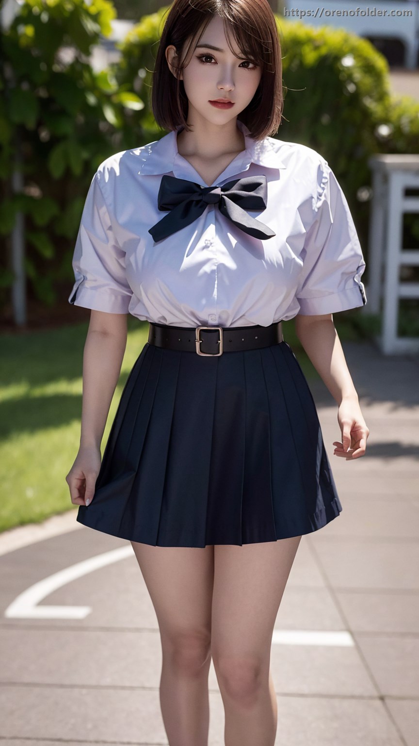 jk, ショートヘアー, ミニスカ, 制服, 太もも, 巨乳, 生足, 着衣, 美脚, 茶髪, 野外