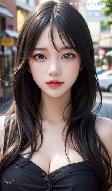 バストトップ, ロングヘアー, 涙袋, 着衣, 谷間, 野外, 黒髪