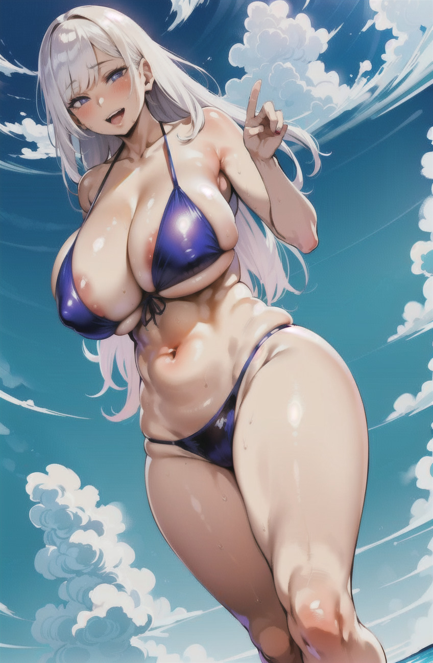 ハミ乳, ハミ乳輪, ビキニ, マイクロビキニ, むちむち, ロングヘアー, 巨乳, 水着, 海, 爆乳, 白髪, 野外