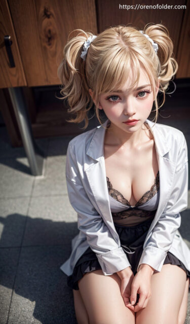 ウェーブ, ツインテール, パーマ, ミニスカ, 巻き髪, 座り, 微乳, 生足, 白衣, 谷間, 金髪
