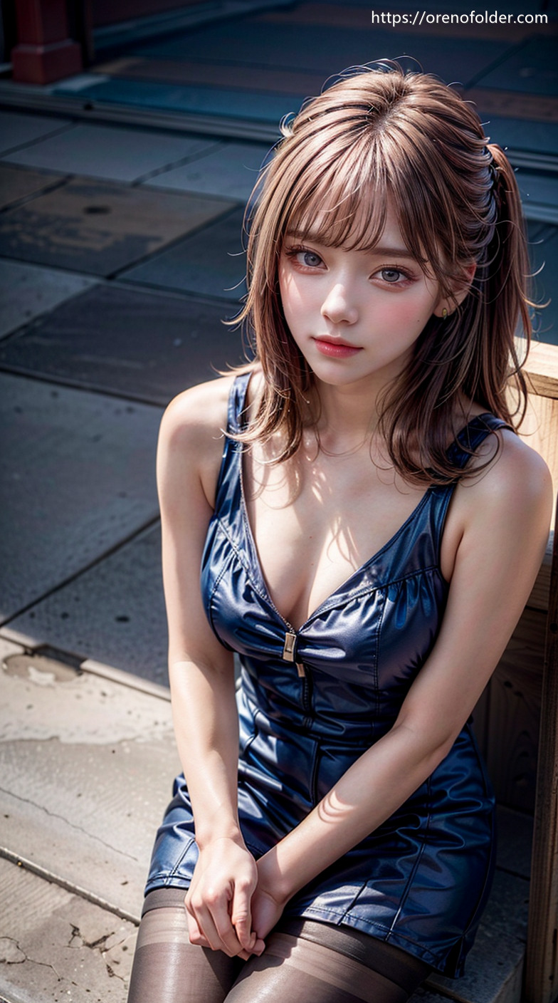 セミロング, タイトミニ, ニット, ノースリーブ, ノーブラ, ハイアングル, ミニスカ, 乳首ポチ, 巨乳, 爆乳, 生足, 着衣, 着衣巨乳, 茶髪, 野外