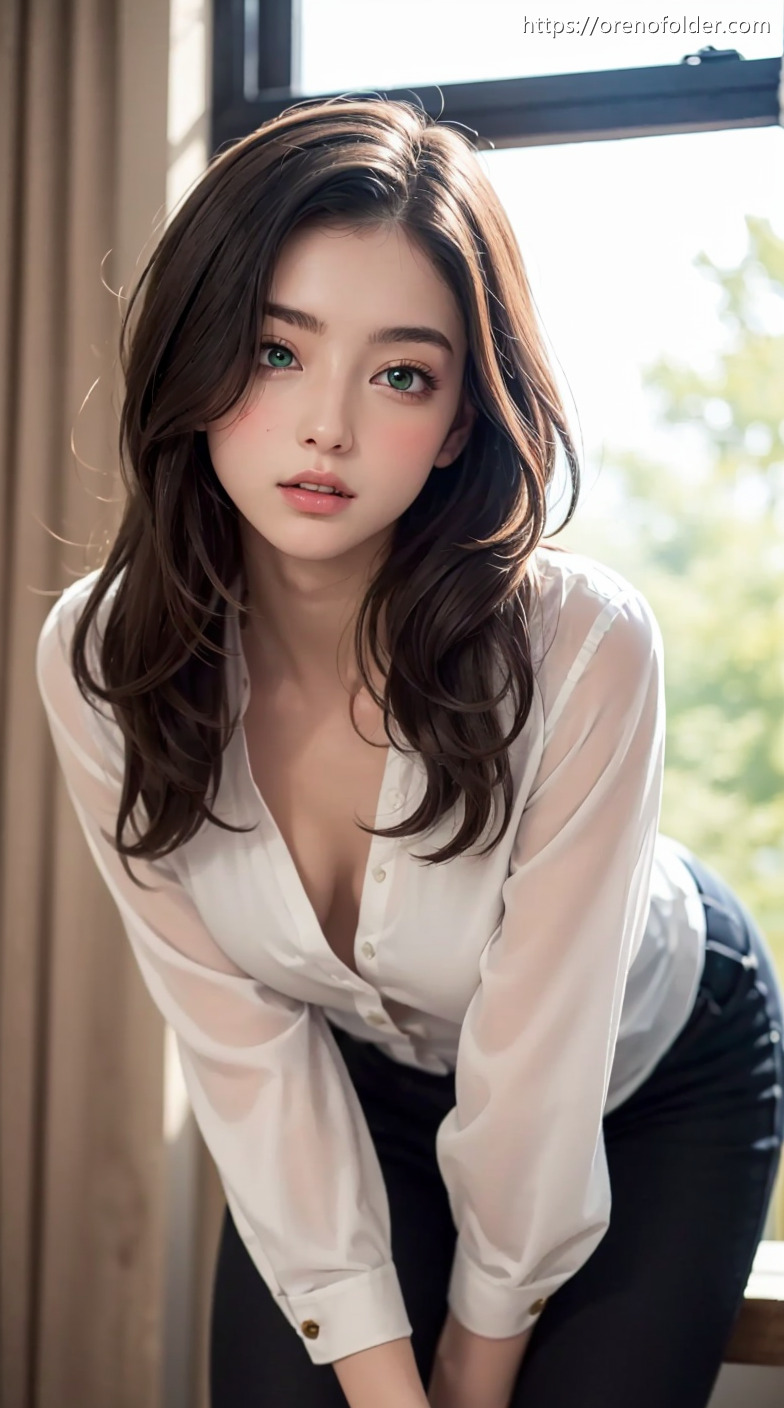 ジーンズ, スキニージーンズ, セミロング, デニム, 前屈み, 巨乳, 爆乳, 白, 着衣, 茶髪, 血管, 谷間, 透け, 青筋, 静脈